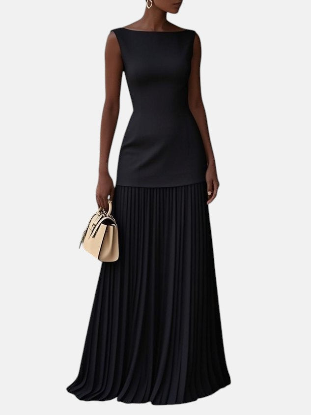 Sumérgete en la elegancia refinada con el vestido largo sin mangas con pliegues Klara, una obra maestra de sofisticación discreta. El elegante corpiño, que realza la figura, fluye hacia una falda larga con pliegues que crean una silueta elegante que favorece desde todos los ángulos. Con su corte sin mangas y su confección estructurada, es la elección perfecta para veladas nocturnas, ocasiones formales o eventos diurnos de alto nivel.