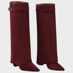 Las botas María fueron diseñadas para quienes buscan un estilo impactante sin sacrificar la comodidad. Con un diseño moderno y escultural, estas botas destacan por su caña ancha y fluida, creando un efecto sofisticado e irreverente, perfecto para realzar cualquier look. El suave ante ofrece una sensación suave y lujosa, mientras que la forma cónica en la planta del pie garantiza un aspecto elegante y alargado. El detalle metálico minimalista en la parte superior aporta un brillo sutil, reforzando la inspiración contemporánea del modelo.