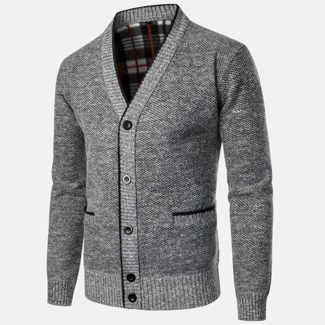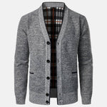 Experimente la calidez clásica del punto con distinción. Este Cárdigan de Botones de Cuello en V para Hombre muestra un forro a cuadros y bolsillos laterales, fusionando artesanía refinada con una silueta contemporánea, ideal para transitar entre oficina y fin de semana con elegancia.