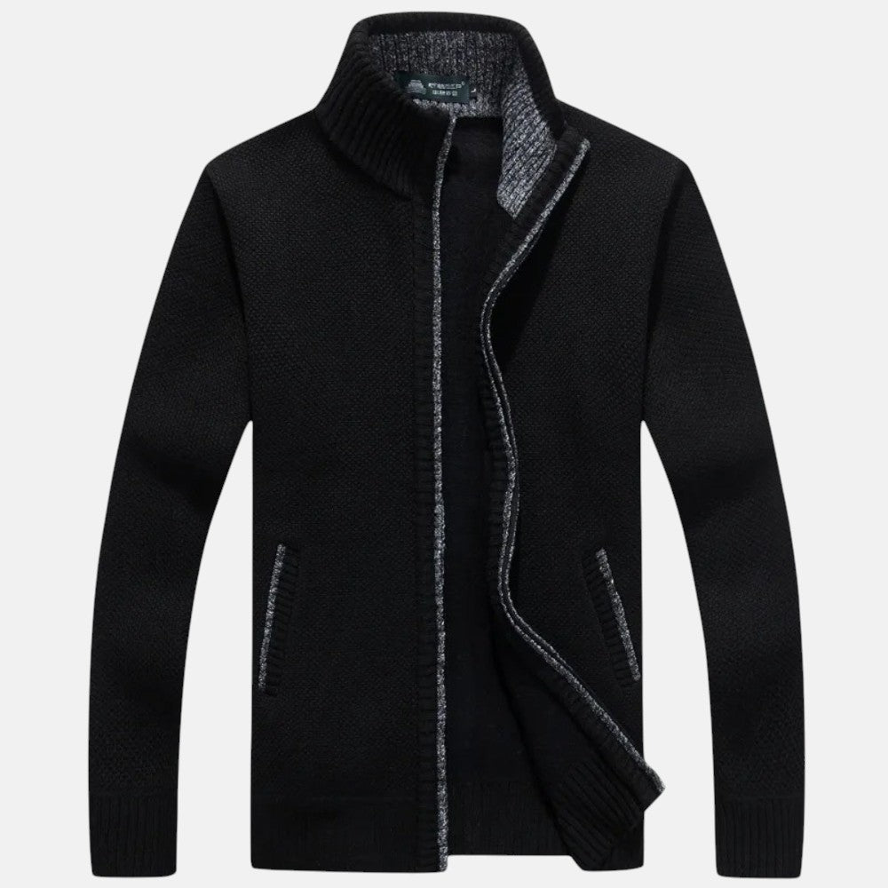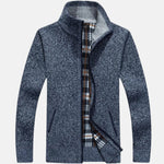 Este cárdigan de punto para hombre fusiona estilo y funcionalidad para climas fríos. Con un cuello simulado y un forro interior de cuadros, ofrece calidez y un toque de elegancia. Sus puños y dobladillo acanalados aseguran la estructura perfecta, manteniendo el frío a raya.