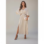 Radiante, elegante y sin esfuerzo estiloso: este vestido largo es la elección perfecta para ocasiones especiales, cenas o noches con estilo. Confeccionado en una tela fluida, ligeramente brillante, en un suave tono champán que favorece todos los tonos de piel.