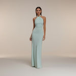 • Escote halter con caída pulida que enmarca los hombros con elegancia